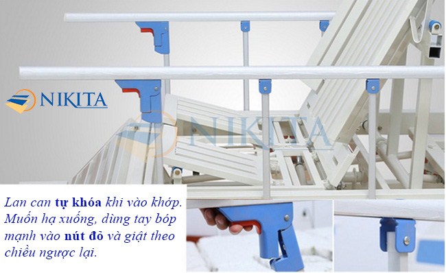 7- Lan can giường có thể tháo gấp gọn dễ giàng khi không cần thiết, Thanh chắn 2 bên giúp bảo vệ người bệnh tránh bị rơi xuống đất. Ngoài ra, có thể gấp gọn đơn giản bằng cách ấn vào nút đỏ trên thành và gập lan can về phía trước.