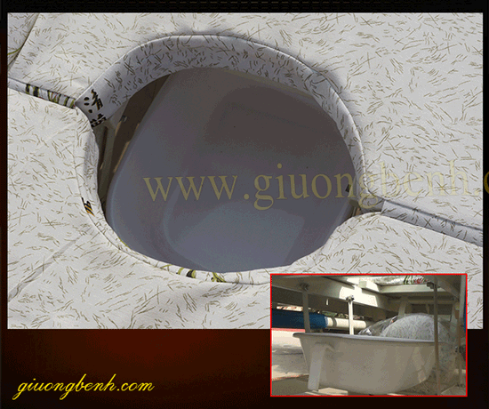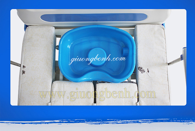 4- Chức năng bô vệ sinh: Sử dụng tay gạt để điều khiển bô vệ sinh, một tấm đệm trên giường sẽ dần tụt xuống, cùng lúc giá bô dưới gầm giường chuyển động tịnh tiến vào. Bô và tấm đệm khoét lỗ chuyển động đều ngược chiều; sẽ dừng lại khi bô bao trọn lỗ khoét trên đệm. Bệnh nhân đi vệ sinh xong, điều khiển cho bô và đệm về vị trí ban đầu; sau đó đem chất thải đi đổ. Sử dụng tay gạt để điều khiển bô vệ sinh, một tấm đệm trên giường sẽ dần tụt xuống, cùng lúc giá bô dưới gầm giường chuyển động tịnh tiến vào. Bô và tấm đệm khoét lỗ chuyển động đều ngược chiều; sẽ dừng lại khi bô bao trọn lỗ khoét trên đệm. Bệnh nhân đi vệ sinh xong, điều khiển cho bô và đệm về vị trí ban đầu; sau đó đem chất thải đi đổ.